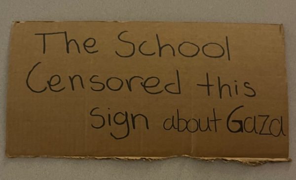 On Monday, Sept. 8, Hedayat brought another sign to school that read “the school censored this sign about Gaza.” Hedayat was called to Hawk’s office. A day later, he made a public comment at the board meeting.