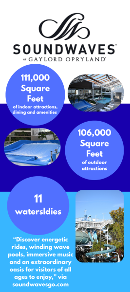 SoundWaves at Gaylord Opryland Resort in Nashville, Tennessee is a four-acre water park that offers both indoor and outdoor attractions. From the park’s indoor surfing to its 11 water slides, SoundWaves provides visitors an experience like no other.